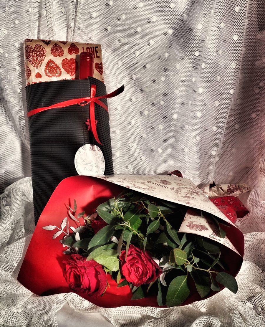 3 rosas,bombones y vino o cava, desde 28€, contáctanos para ver ideas.