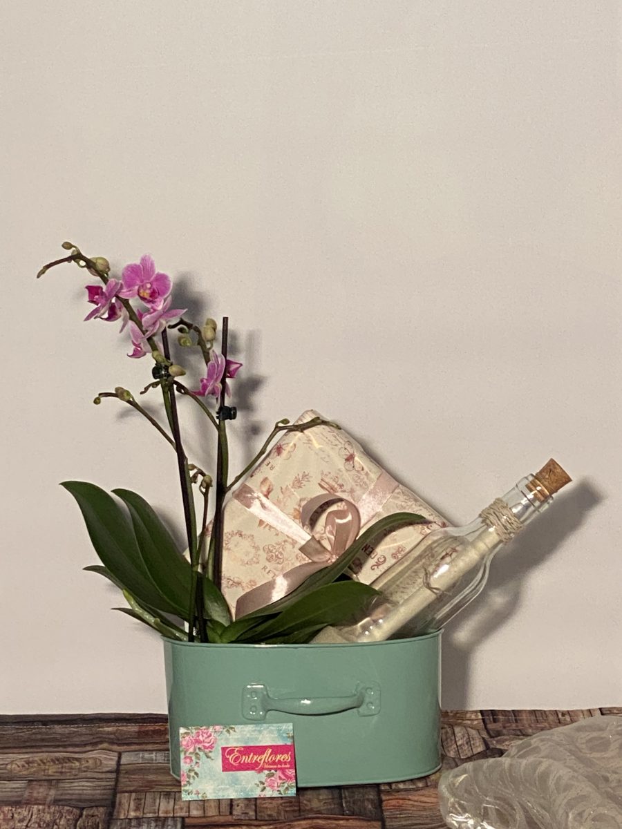 Caja lata, orquidea, mensaje en una botella y bombones desde 42€, consúltanos.