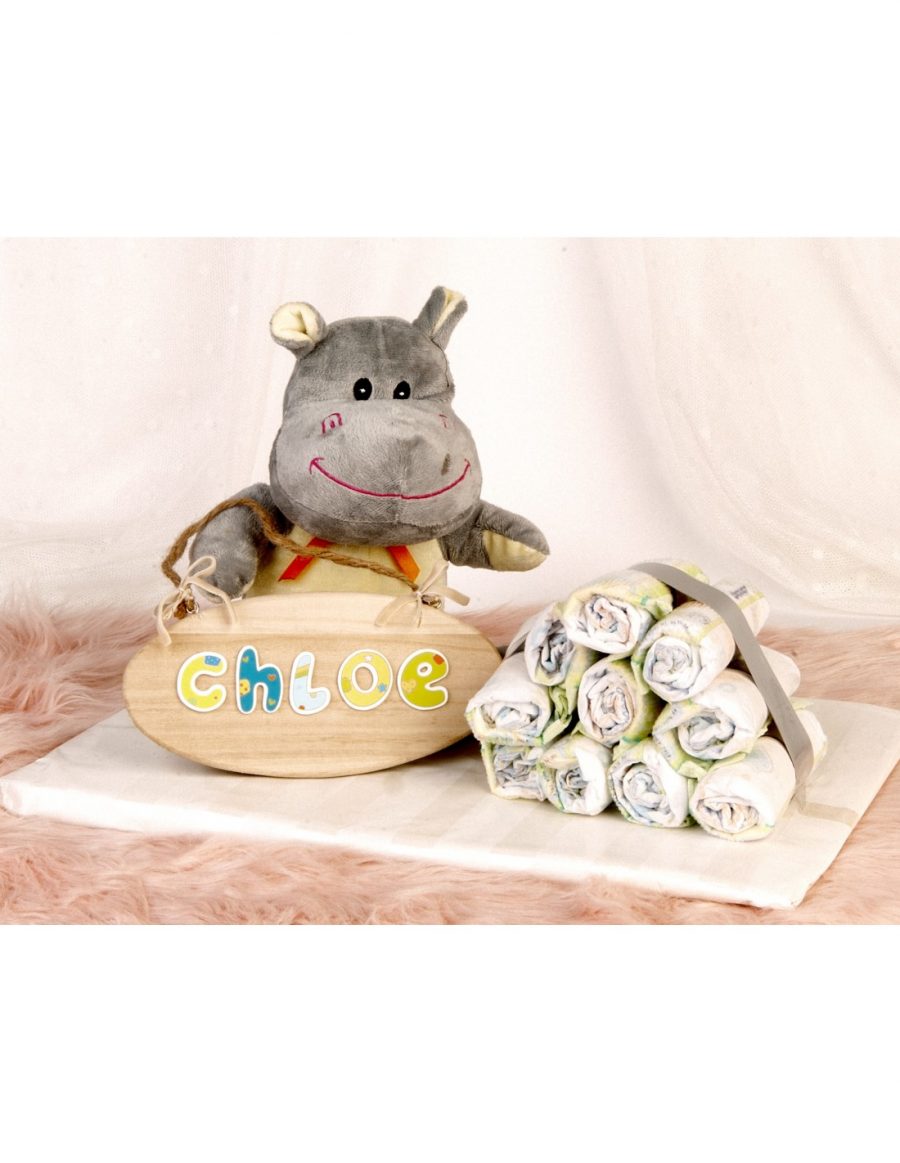 Peluche con placa, nombre y pañales